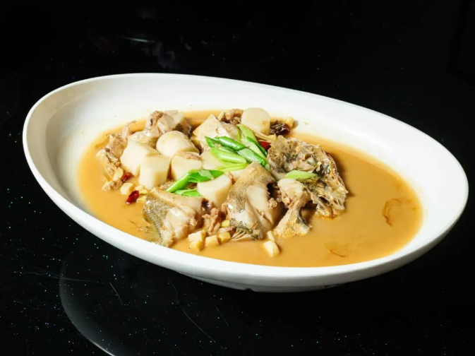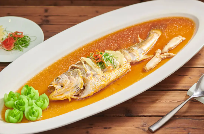 Fresh, live yellow croaker is selected, cleaned to remove any fishy taste, and lightly steamed to preserve the fish’s most original flavor. The fish flesh is translucent, firm yet tender, melting in the mouth with a refreshing aroma. The steam carries the fragrance of ginger and scallions, and the fish subtly absorbs the essence of the sea in the warm vapor. The clear, savory broth, carrying the scent of the ocean and the sweetness of the fish, leaves an endless aftertaste.
