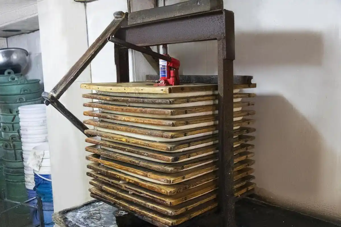 The coagulated bean curd is carefully poured into a wooden frame, spread in even, flat layers. To press out as much water as possible and ensure the tofu is firm, springy, and chewy, considerable force is required. Zhu Haifeng has his own technique; he abandoned the traditional method of using heavy stones and instead employs a hydraulic jack to press the tofu, saving significant effort.