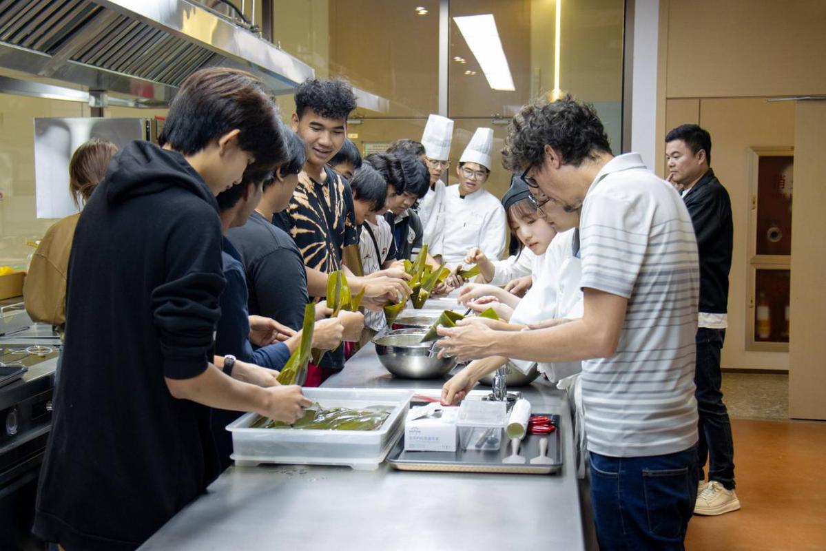 The subsequent hands-on culinary practice session, "Co-creating with Ingenuity · The Beauty of Handicrafts," brought the event to a climax. In the culinary training room and pastry training room, Chinese and international students were divided into six groups to prepare specialty dishes from their respective countries. In the Thai Flavor Workshop, the spicy and sour notes of Tom Yum Goong (spicy shrimp soup) and Som Tum (green papaya salad) left a lasting impression; the Taizhou Cuisine Workshop presented authentic dishes like Mapo Tofu and Sweet and Sour Pork with Pineapple. The most eye-catching part was the collaborative challenge area, where foreign teachers Ariel and Mike joined students at the table, learning to wrap zongzi, make the Taizhou specialty shibingtong (a type of thin pancake roll), and try their hand at creative lollipop DIY. When international students tried wrapping zongzi for the first time, they were full of praise for the fragrant scent of the bamboo leaves and the soft, sticky texture of the glutinous rice. Meanwhile, under the guidance of Chinese teachers and students, the foreign teachers also learned to roll fresh, savory fillings into shibingtong, experiencing the "flavors of Taizhou on the tongue."