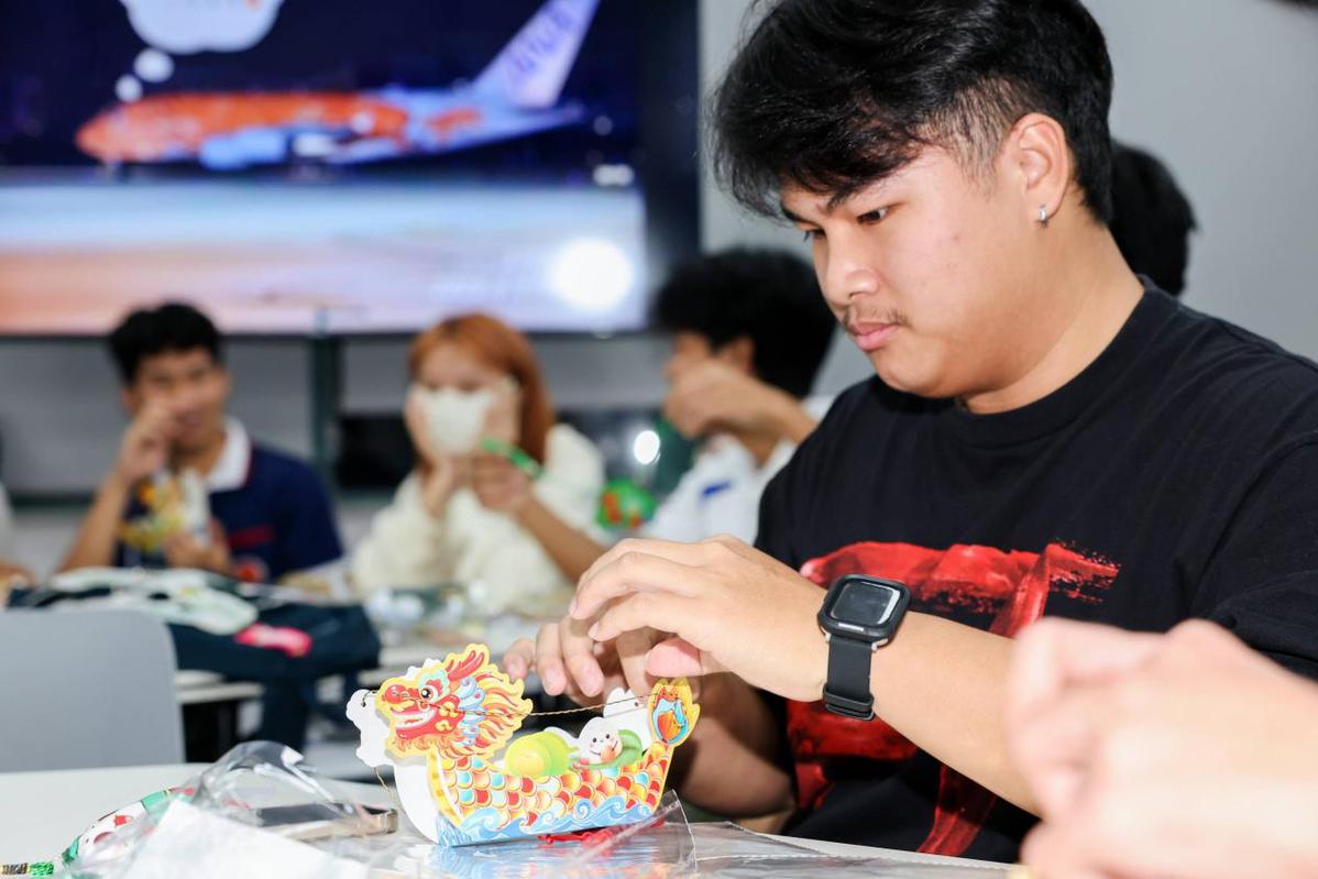 On the afternoon of May 27th(2025), the first event, "Weaving Emotions with Ingenuity · Sino-Thai Handicrafts – Dragon Boat Festival ICH Culture Workshop," kicked off in Classroom 111 of the Sino-German Institute. Chinese and Thai students worked in groups, experiencing traditional Chinese Dragon Boat Festival customs under the guidance of instructors. The students hand-stitched sachets filled with mugwort, decorating them with colorful silk threads, symbolizing warding off evil and praying for good fortune. They also tried their hand at weaving bamboo-woven dragon boat ornaments, experiencing the ingenuity of traditional Chinese handicrafts. Thai students expressed that this was their first encounter with Dragon Boat Festival culture, and through hands-on practice, they gained a more intuitive understanding of Chinese festive customs. After the event, students kept their creations as souvenirs, serving as a testament to Sino-Thai friendship.