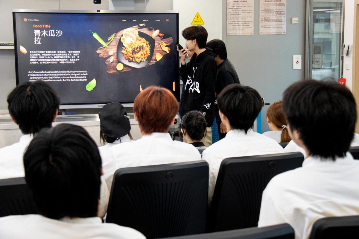 The activity on the 28th, themed "Cultural Tracing · Culinary Common Origins," focused on a dialogue between Chinese and Thai food cultures. At 2 PM, a Sino-Thai food culture sharing session was held in the cooking demonstration room on the fourth floor of Shunji Canteen. Chinese and Thai students each presented three representative sets of food culture, delving into the similarities and differences between the two cuisines, from ingredient selection to cooking techniques. During the interactive Q&A session, Thai students showed strong interest in the diversity of Chinese cuisine, while Chinese students marveled at the unique balance of sour and spicy flavors in Thai food.