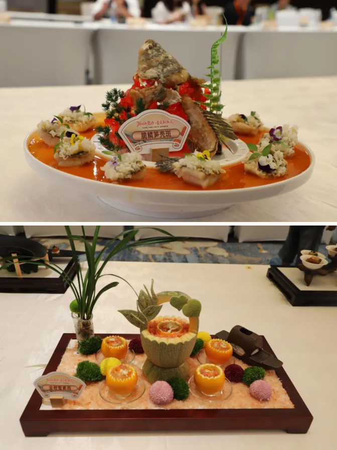 This competition brought together the culinary strengths from across the province, including Hangzhou, Ningbo, and Wenzhou. Establishments like Hangzhou Junrun Minglan Hotel, Ningbo Xijie Catering, and Wenzhou Ouzhengwei Catering brought their original dishes, while local contestants from Taizhou also showcased their specialties. Shunji Pujiang Hui presented Taizhou Yellow Croaker and Tofu Pudding, and Xinglong Catering Group brought 'Surfing' Hand-Smashed Fish Noodles, competing alongside dishes from other regions.