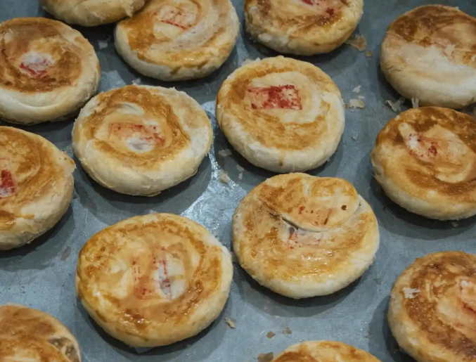 As the Mid-Autumn Festival approaches, the staff in Hongji’s kitchen grow increasingly busy. They skillfully wrap the prepared fillings in dough made from oil pastry and flour, place the portions onto oiled paper, press them into molds, and neatly arrange them. Then, they stamp each mooncake with a red seal indicating its flavor, brush them with egg yolk, and slide them into the oven—all in one seamless workflow. The room is filled with an irresistible fragrance.