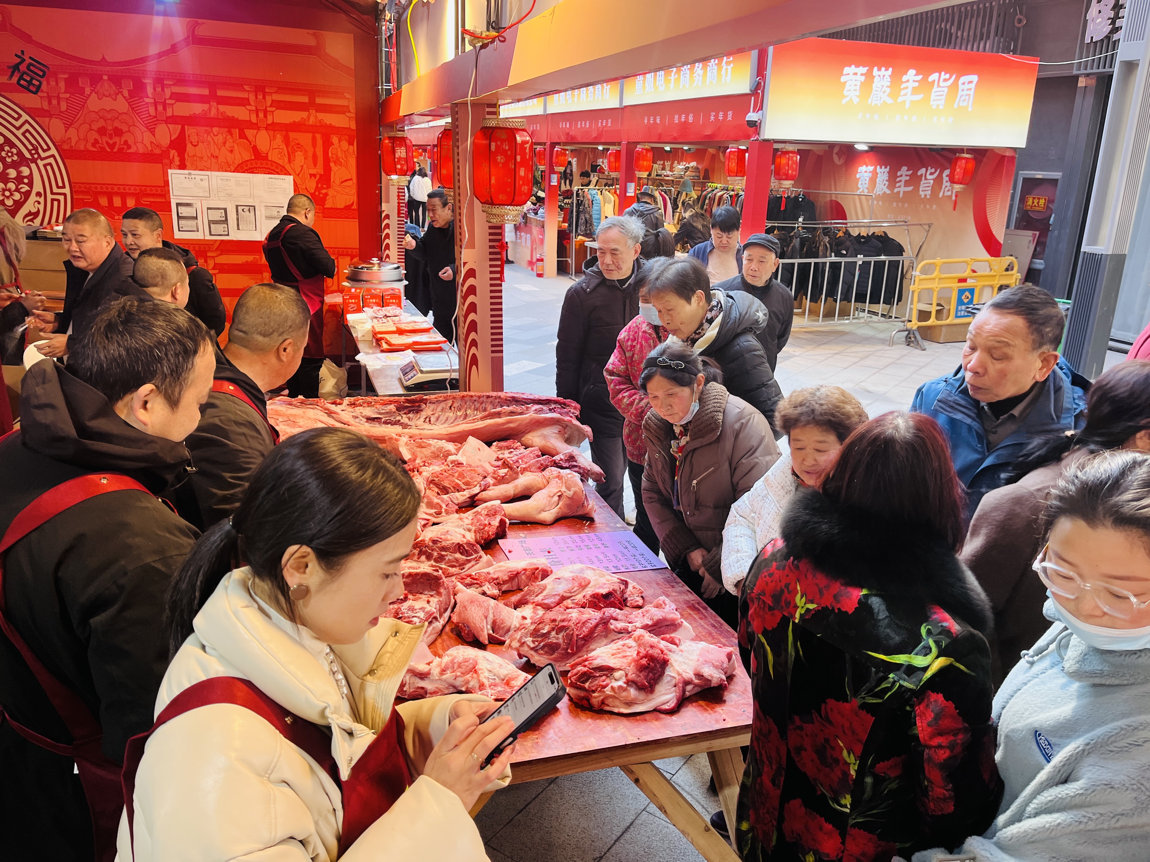 At the stall run by Zhejiang Chengyuan Food Co., Ltd., staff were busy dividing tasks—carrying pork, cutting it into portions, weighing, and packaging—all in a lively and efficient rhythm. A steady stream of customers came to purchase pork, with one local shopper, Ms. Wang, noting, "The prices are very reasonable. I’m buying this for our New Year’s thanksgiving ceremony."
